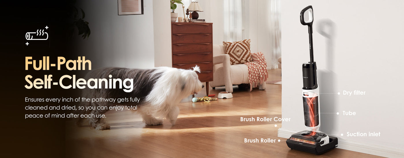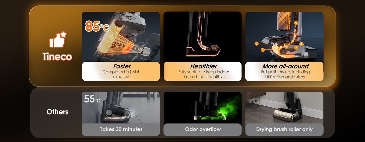 Using heated fresh water to effectively dissolve stains from the pipe to the brush roller, and then using 185°F hot air to effectively dry every part of the machine. Truly worry-free after use.