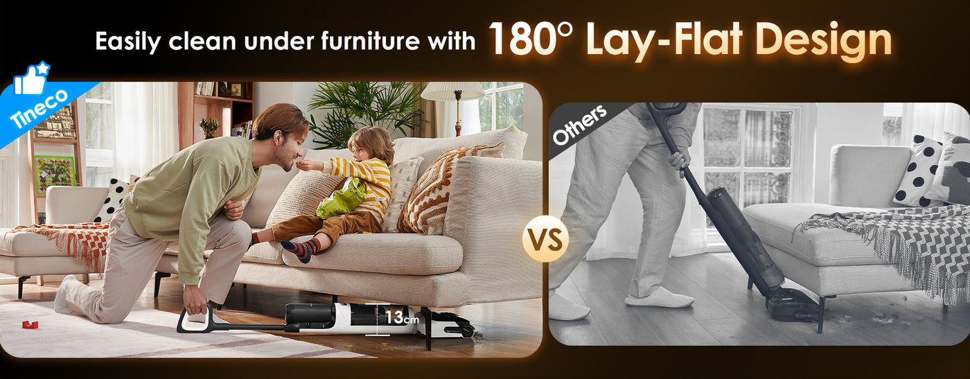 Effortlessly reclines to a full 180°, enabling easy access under furniture and into low spaces to reach hidden dust. With a compressed height of 5.1 inches, it effectively cleans hard-to-reach areas.