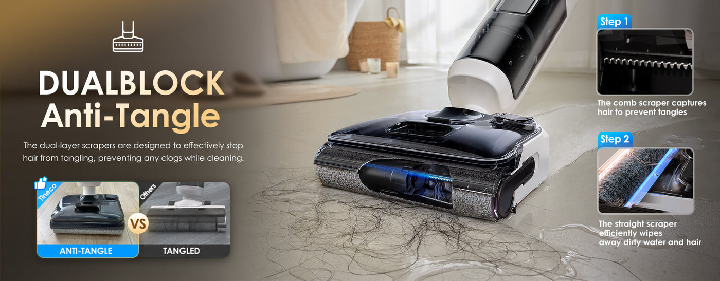 The dual-layer scrapers prevent hair tangling and clogging by capturing hair with a comb scraper and wiping away dirty water and hair with a straight scraper.
