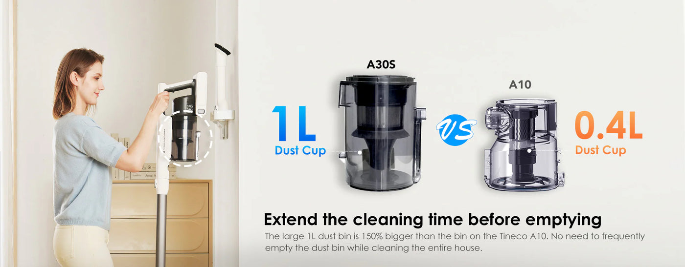 The large 1L dust bin is 150% bigger than the bin on the popular Tineco A10.