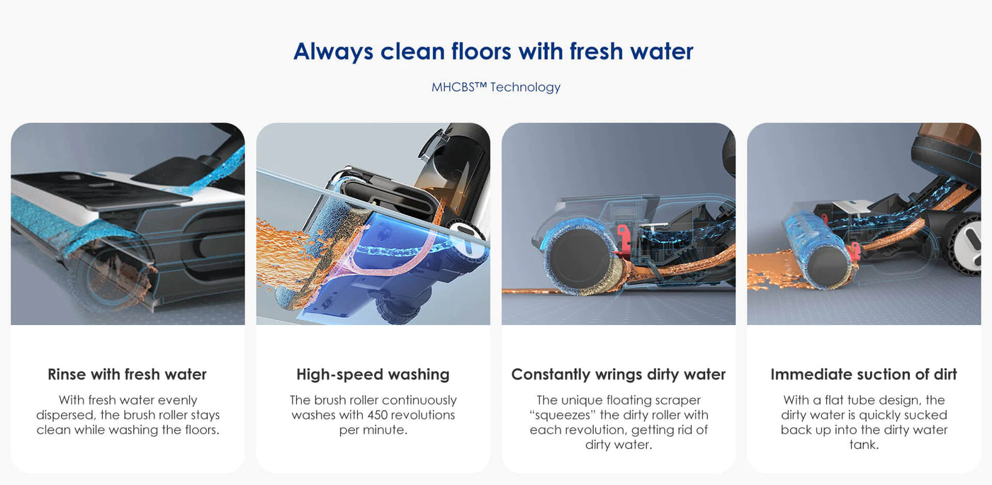 The dual-tank system keeps clean and dirty water separate enabling it to continuously clean with fresh clean water and cleaning detergent, and now does so with higher 96% efficient dirty water recycling (for less refills), all at a constant 450rpm.