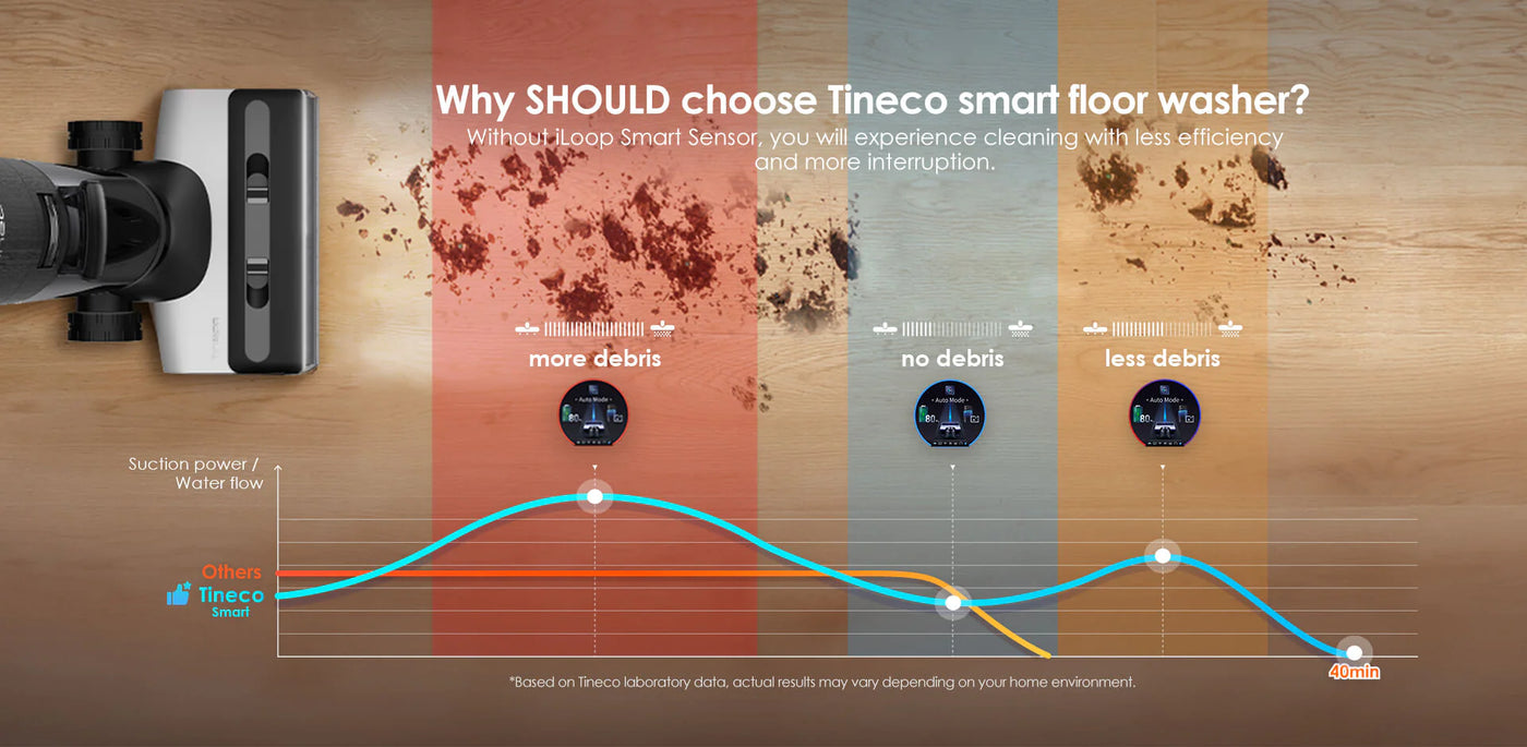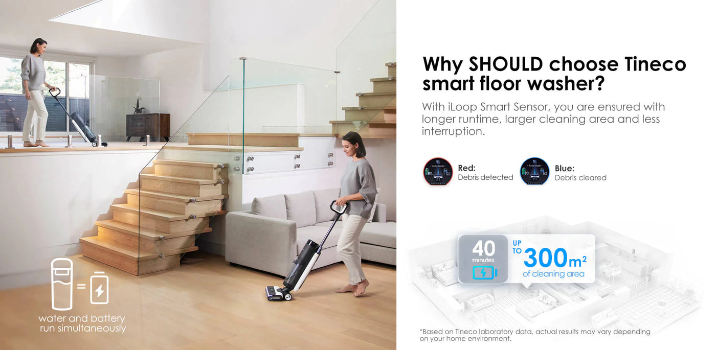 Both clean & dirty water and battery power are constantly adjusted by Tineco iLoop, meaning FLOOR ONE S7 PRO wet dry vacuum allows you to clean 40 minutes (thatās enough to clean up to about 300m2) with less refilling, less emptying, and less recharging.