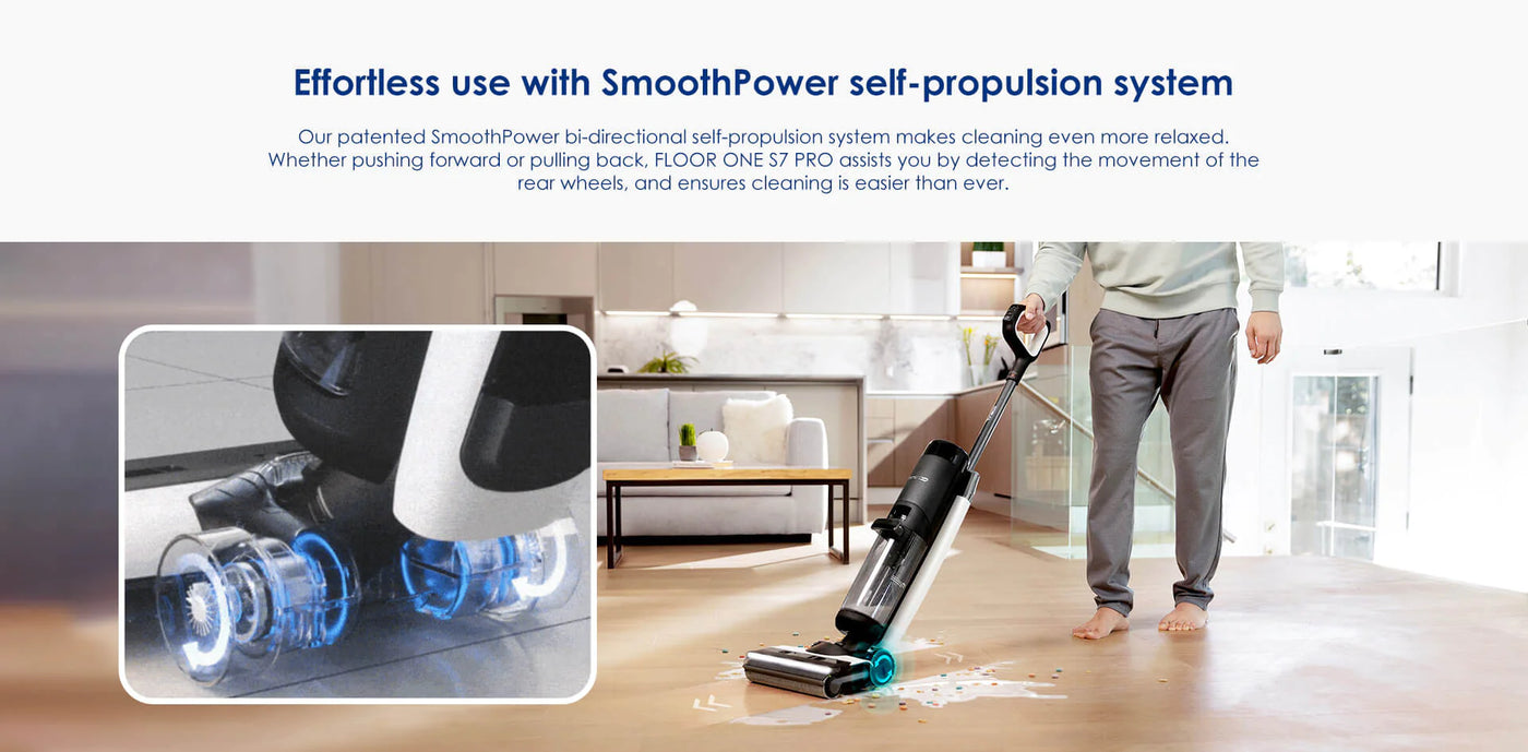Whether pushing forward or pulling back, FLOOR ONE S7 PRO assists users by detecting the movement of the wheels and uses SmoothPower⢠bi-directional motor technology to self-propel itself forward or back, allowing it to feel extremely lightweight and be incredibly manoeuvrable.