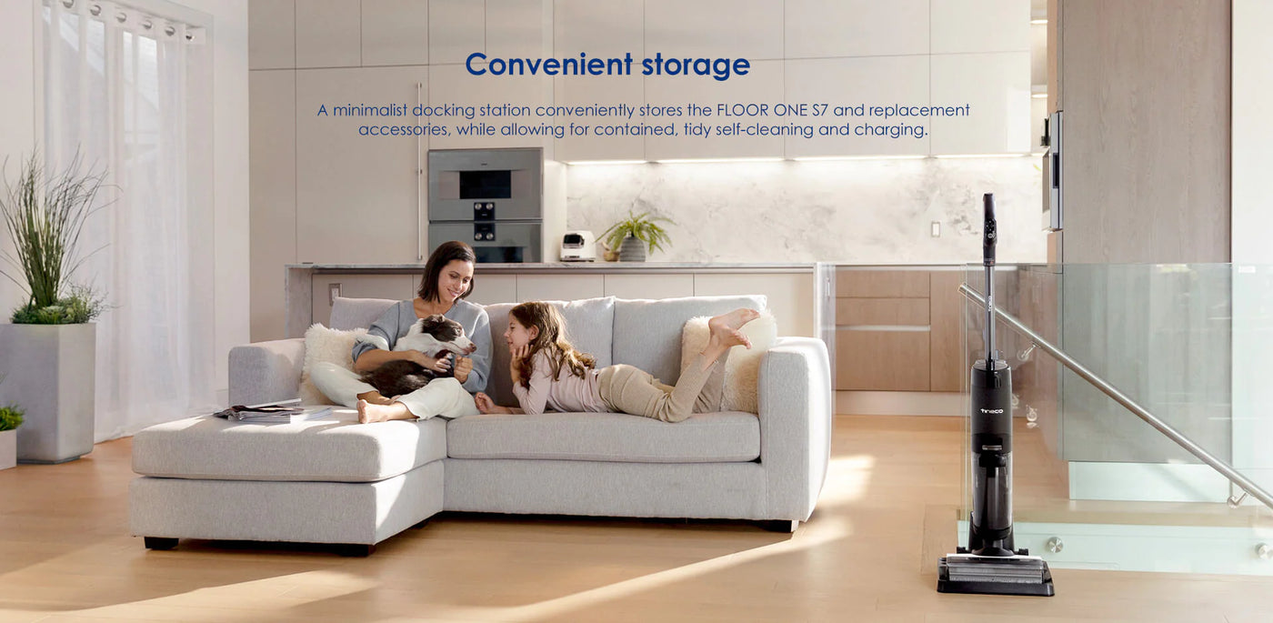 A minimalist docking station charges FLOOR ONE S7 PRO while allowing it to self-clean, in addition, it stores and organises all the included accessories in one place for the utmost convenience.